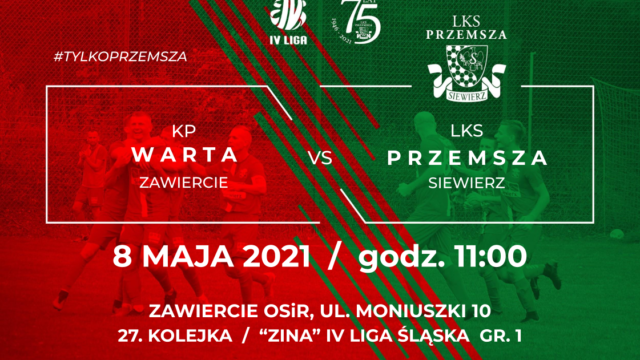 W sobotnie przedpołudnie Przemsza Siewierz rozegra w Zawierciu mecz XXVII kolejki Zina IV ligi śląskiej z Klubem Piłkarskim Warta. Zawiercianie walczą jeszcze o miejsce gwarantujące grę w barażach o III ligę, ale do lidera tracą już 9 punktów. Obecnie trzecia drużyna naszej grupy ma na koncie 45 punktów (bilans 13-6-6). Jej bilans w meczach rundy rewanżowej to cztery zwycięstwa (Unia Kosztowy, Mikołów, Grodziec i Śląsk), remis (Raków II) i cztery porażki (Szczakowianka, Unia D. G., Drama, Gwarek) co daje 13 punktów wiosną. W środę „Warciarze” zremisowali z liderem w Zawierciu 1:1.