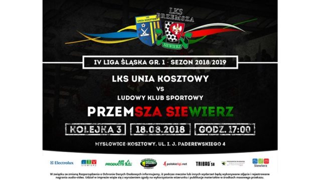 Już pojutrze, tj. w sobotę 18 sierpnia, Przemsza Siewierz uda się na pierwszy wyjazdowy mecz w tym sezonie. W III kolejce Haiz IV ligi siewierzanie zagrają w Mysłowicach z Unią Kosztowy. Beniaminek ligi nie przegrał żadnego z dwóch pierwszych spotkań. W inauguracyjnej kolejce kosztowianie pokonali MKS Myszków 2-1, a w ub. środę zremisowali w Rudzie ze Slavią 0-0. LKS jak wiemy nie ugrał jeszcze nawet punktu, w dodatku na własnym stadionie – porażki 0-2 z Rakowem II oraz bolesna porażka 2-4 z Szombierkami.